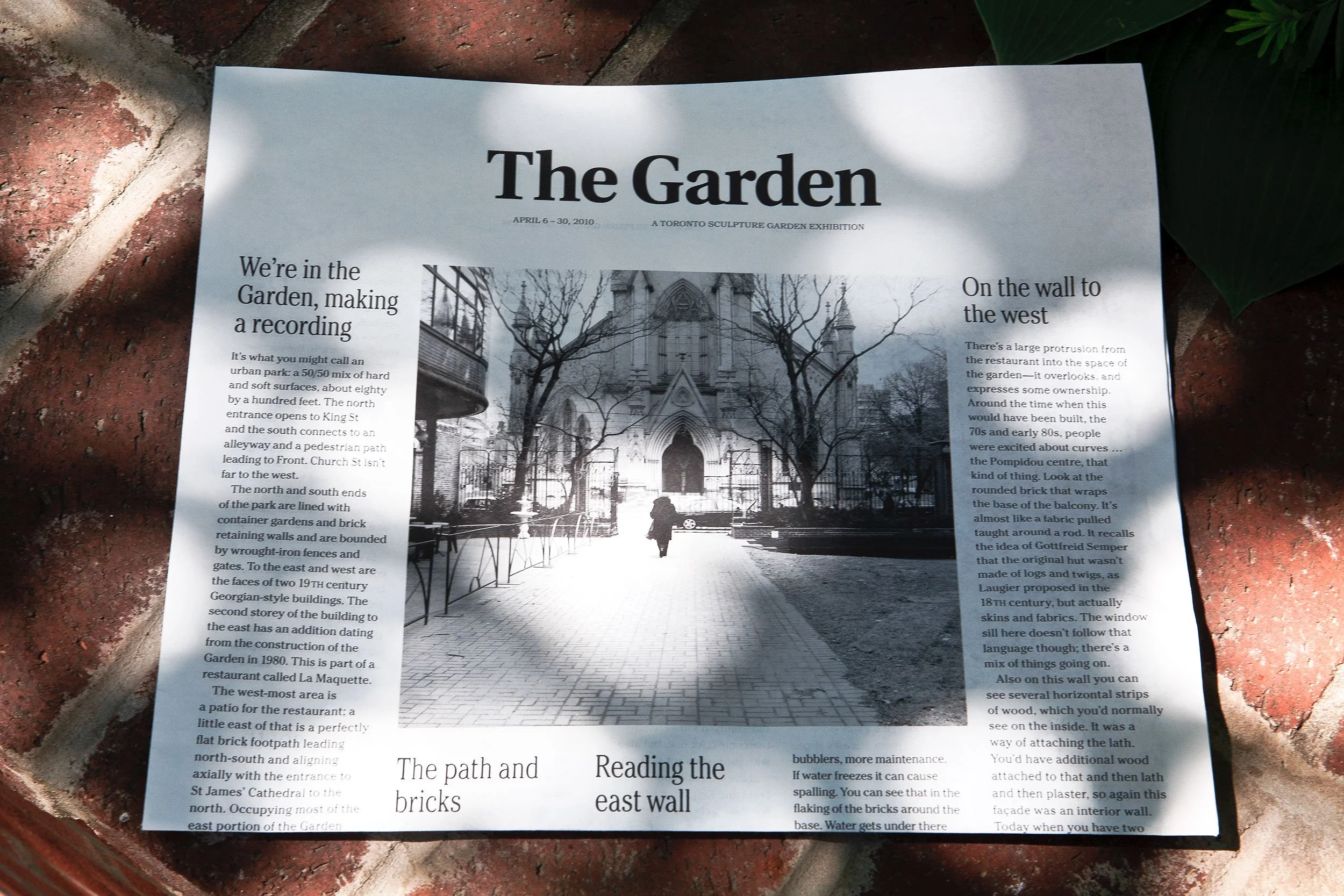 The work for Toronto Sculpture Garden takes the form of a single-sheet newspaper, The Garden, that is available in the boxes at each entrance to the park. Its content proposes a discourse few would consider to be news; it’s static, intensely local, and concerned with details far outside the conventions of the newsworthy. It also presents itself as public art but suggests a private activity. We think of it as a way to get to know this space better (for locals, tourists, and participating artists), and as the object of a common leisure activity for parks: reading. It is a text that, by necessity, addresses the recent past of the space, with some anticipation of its present and future.